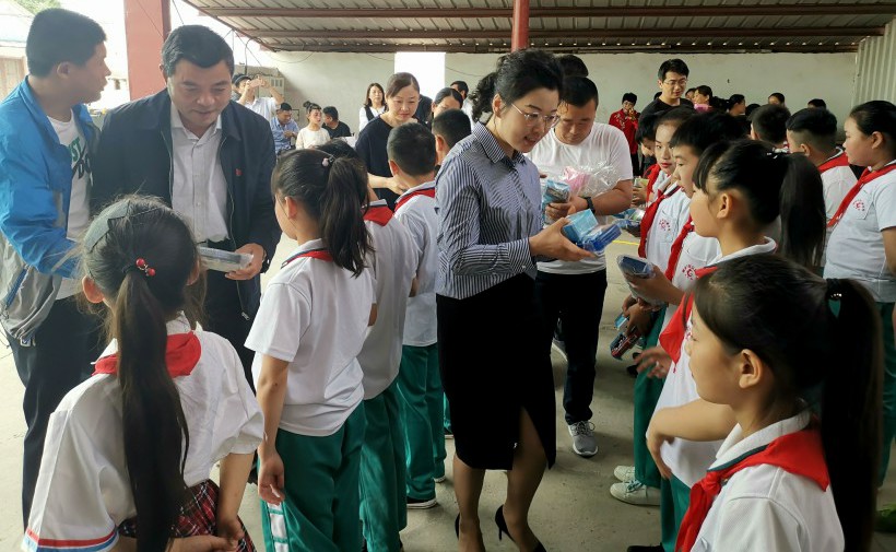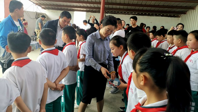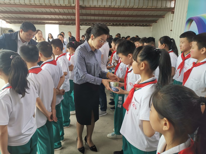 三源建設(shè)副總王煥麗為優(yōu)秀學(xué)生送上學(xué)習(xí)用品和節(jié)日的祝福,孩子們收到節(jié)日禮品,露出天真的笑臉。
